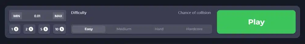 Dopo aver impostato l’importo delle puntate, l’utente dovrebbe decidere con quale rischio vuole giocare. Il livello Easy è il rischio minimo, dove sono presenti coefficienti bassi. Il livello di rischio più alto è Hardcore. In esso è possibile ottenere rapidamente una grande vincita grazie all’alto coefficiente.
